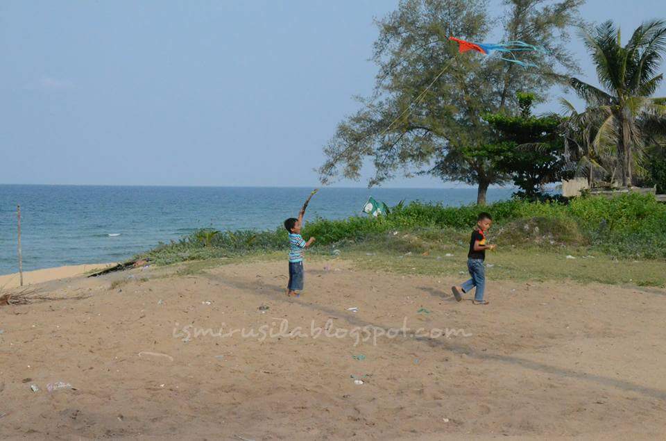 Singgah sebentar di pantainya. Melihat kanak-kanak bermain layang-layang. Orang Kedah panggil wau.